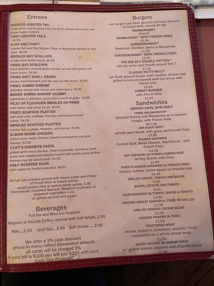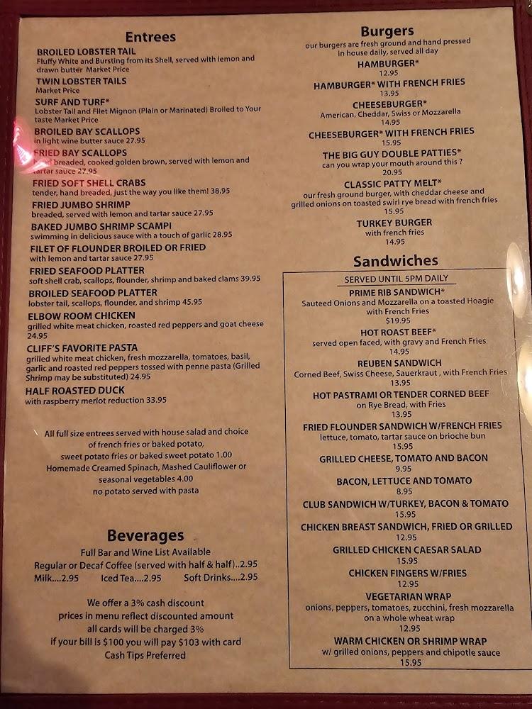 Vegetarians will find suitable dishes, ensuring everyone leaves satisfied. Prices are reasonable, with most selections available under $15. The diverse offerings cater to different tastes, making Cliff's a perfect local stop for anyone seeking quality food and a friendly atmosphere.
