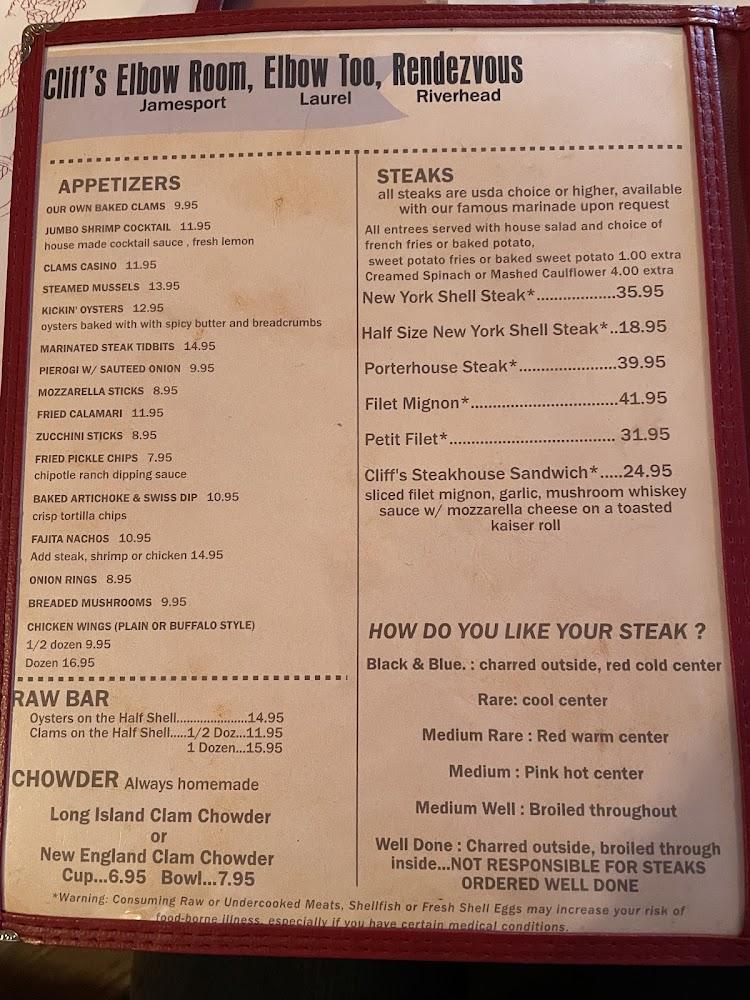 Welcome to Cliff's Rendezvous, your go-to destination in Riverhead for delicious American barbecue and a vibrant bar experience. Located at 313 E Main St, our establishment is perfect for lunch, dinner, or a solo meal in a relaxed atmosphere. Enjoy our extensive selection of local specialties, excellent cocktails, and a broad beer menu, all while catching your favorite sports on screen. We offer convenient services like takeout and contactless delivery, along with wheelchair accessibility for all guests. Join us for happy hour specials or a cozy meal by the fireplace—Cliff's Rendezvous is where great food and camaraderie meet!